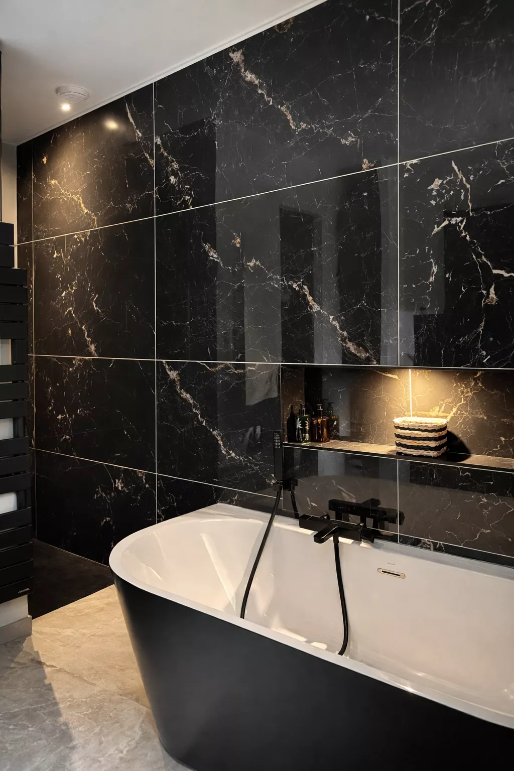 Le sol est habillé du carrelage ISLA Canyon Ivory en 60×120, offrant une base claire et apaisante. Les murs, quant à eux, sont revêtus du modèle Windsor Black en 60×120, pour une ambiance contemporaine et sophistiquée.