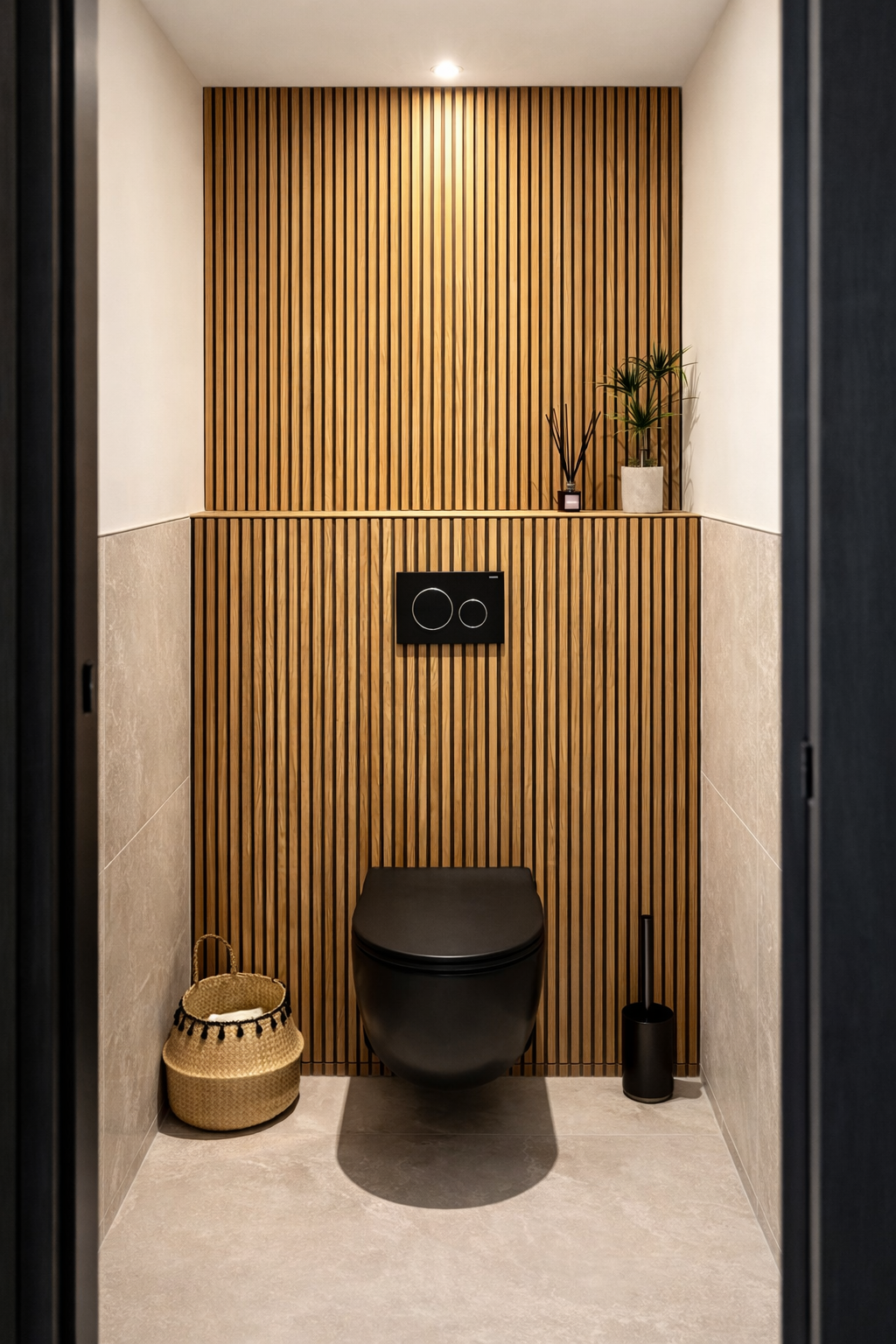 Pour cet espace toilettes, une composition moderne et structurée a été imaginée.